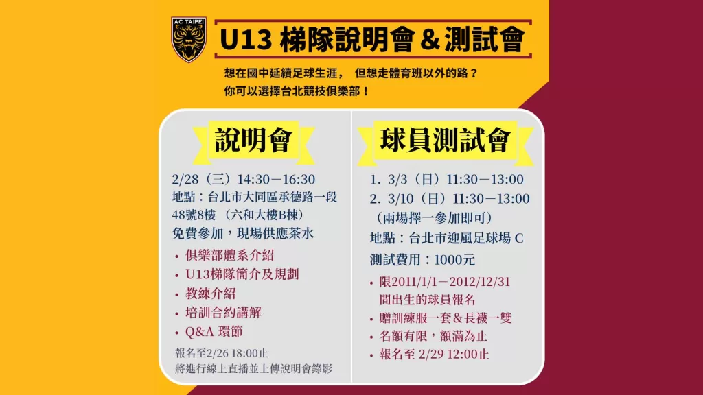 AC Taipei U13 梯隊說明會&球員測試會開放報名!